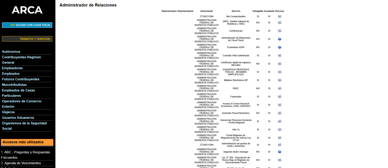 Gracias por responder Ivan! intuyo que hablás de esta pantalla, el tema es que el usuario que tiene cargado el certificado es el cuit "x", cuando voy al administrador de relaciones y pongo en representantes del usuario ese cuit x, no me aparece el servicio, lo mismo cuando pongo ese cuit x en representados por el usuario. Ahora bien, el cuit x tambien representa a otro cuit, cuando entro a "representados por el usuario" y pongo el cuit del representado, ahí si aparece (segunda foto). O sea, podría darlo de baja para el usario al representado por el cuit x, pero no para el cuit x en sí?