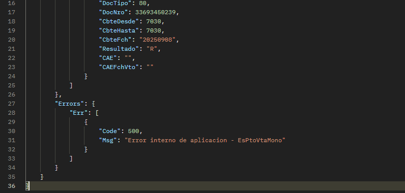 no deja hacer la numero 8 tira error. { "status": "error", "message": "Error al solicitar CAE", "errors": { "Err": { "Code": 500, "Msg": "Error interno de aplicacion - EsPtoVtaMono" } } }
