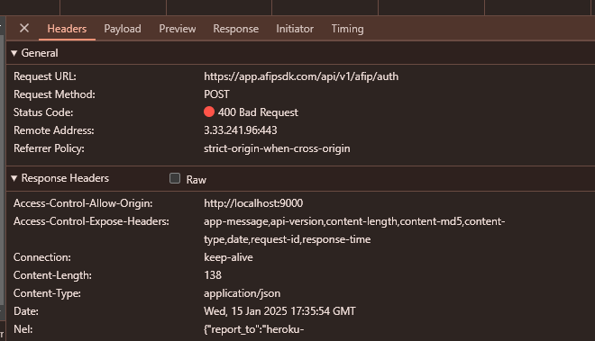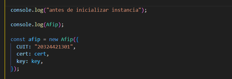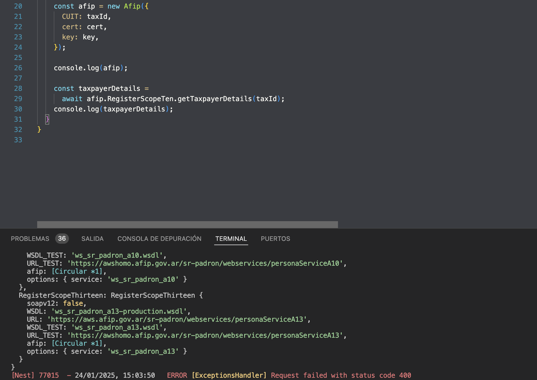 la parte de new AFIP me conecta y me loguea la respuesta del objeto, pero cuando quiero usarlo para probar la creacion de un comprobante o en este caso que me retorne los detalles del taxId me tira error 400 con cualquier cosa