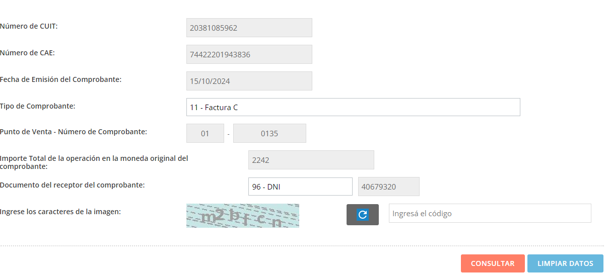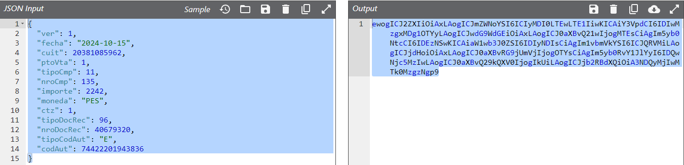 { "ver": 1, "fecha": "2024-10-15", "cuit": 20381085962, "ptoVta": 1, "tipoCmp": 11, "nroCmp": 135, "importe": 2242, "moneda": "PES", "ctz": 1, "tipoDocRec": 96, "nroDocRec": 40679320, "tipoCodAut": "E", "codAut": 74422201943836 }