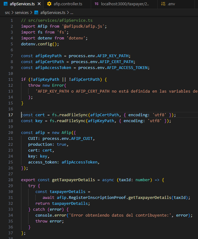 const Afip = require('@afipsdk/afip.js'); const fs = require("fs"); const CUIT = 30650560821; const afip = new Afip({ CUIT: CUIT, cert: '', key:'', production: false });