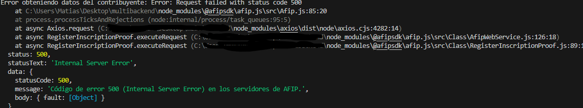 Node.js v18.20.4 Error: (501) Error interno de base de datos: - Metodo FECompUltimoAutorizado at ElectronicBilling._checkErrors (C:\Users\marti\OneDrive\Escritorio\explicacion\node_modules@afipsdk\afip.js\src\Class\ElectronicBilling.js:404:10) at ElectronicBilling.executeRequest (C:\Users\marti\OneDrive\Escritorio\explicacion\node_modules@afipsdk\afip.js\src\Class\ElectronicBilling.js:349:14) at process.processTicksAndRejections (node:internal/process/task_queues:95:5) Error: (501) Error interno de base de datos: - Metodo FECompUltimoAutorizado Error: (501) Error interno de base de datos: - Metodo FECompUltimoAutorizado at ElectronicBilling._checkErrors (C:\Users\marti\OneDrive\Escritorio\explicacion\node_modules@afipsdk\afip.js\src\Class\ElectronicBilling.js:404:10) at ElectronicBilling.executeRequest (C:\Users\marti\OneDrive\Escritorio\explicacion\node_modules@afipsdk\afip.js\src\Class\ElectronicBilling.js:349:14) at process.processTicksAndRejections (node:internal/process/task_queues:95:5) at async ElectronicBilling.getLastVoucher (C:\Users\marti\OneDrive\Escritorio\explicacion\node_modules@afipsdk\afip.js\src\Class\ElectronicBilling.js:66:11) at async C:\Users\marti\OneDrive\Escritorio\explicacion\index.js:34:30