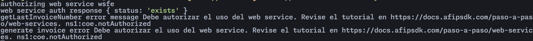 Buenas! Estoy intentando emitir una factura C y por más que tenga un certificado y haya autorizado el ws de facturación electronica me devuelve este error cuando llamo a afip.ElectronicBilling.getLastVoucher y afip.ElectronicBilling.createVoucher