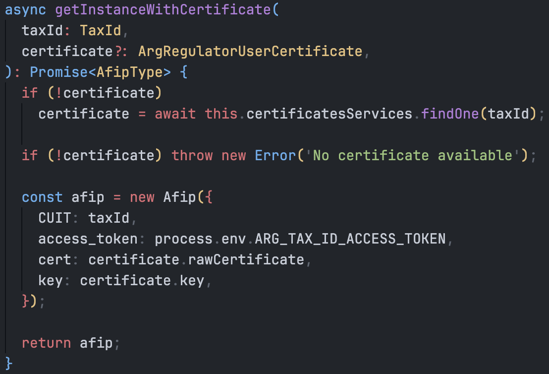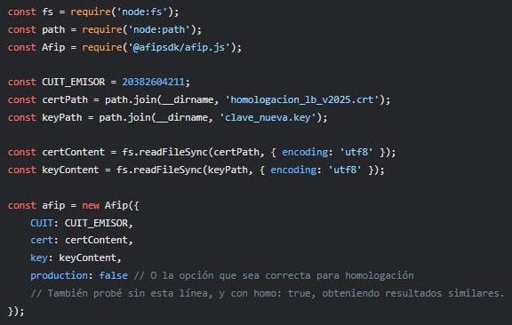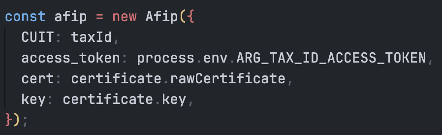 const afip = new Afip({ CUIT: CUIT, key, cert: crt });