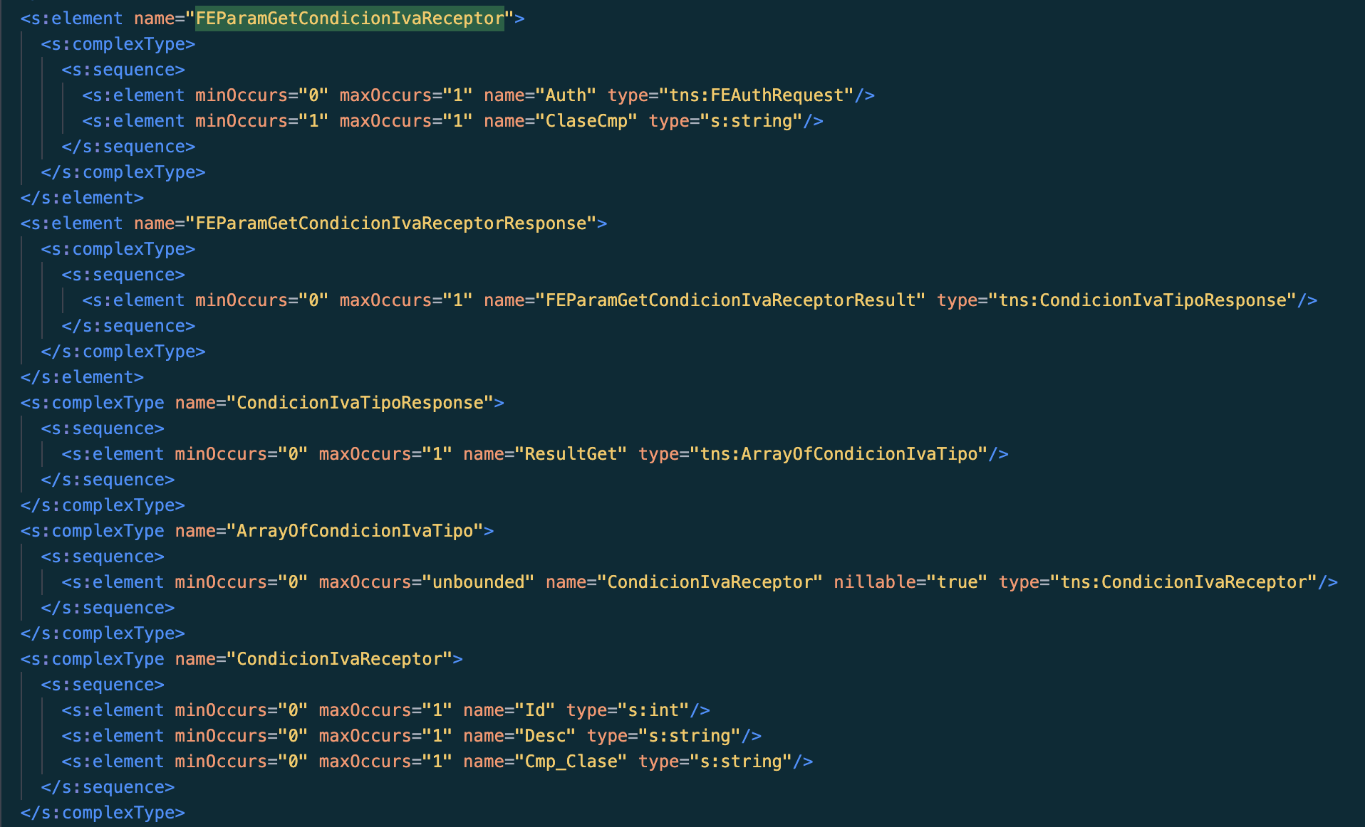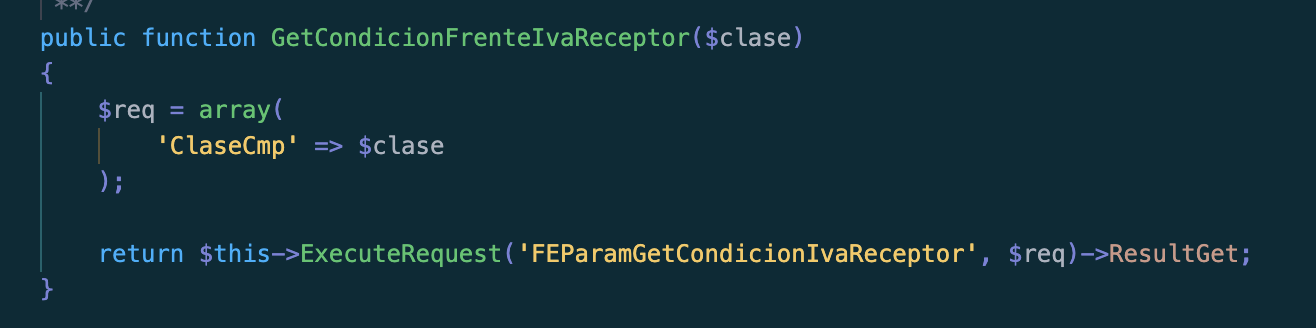 Jantpf 2025-03-10T14:42:19.883Z Sí lo tengo definido en wsfe.wsdl: Ivan 2025-03-10T16:17:28.397Z Y que codigo ejecutas pra que te de ese error? Jantpf 2025-03-10T16:46:21.173Z En la clase ElectronicBilling he declarado la función GetCondicionFrenteIvaReceptor a la cual llamo así:$afip->ElectronicBilling->GetCondicionFrenteIvaReceptor('C');