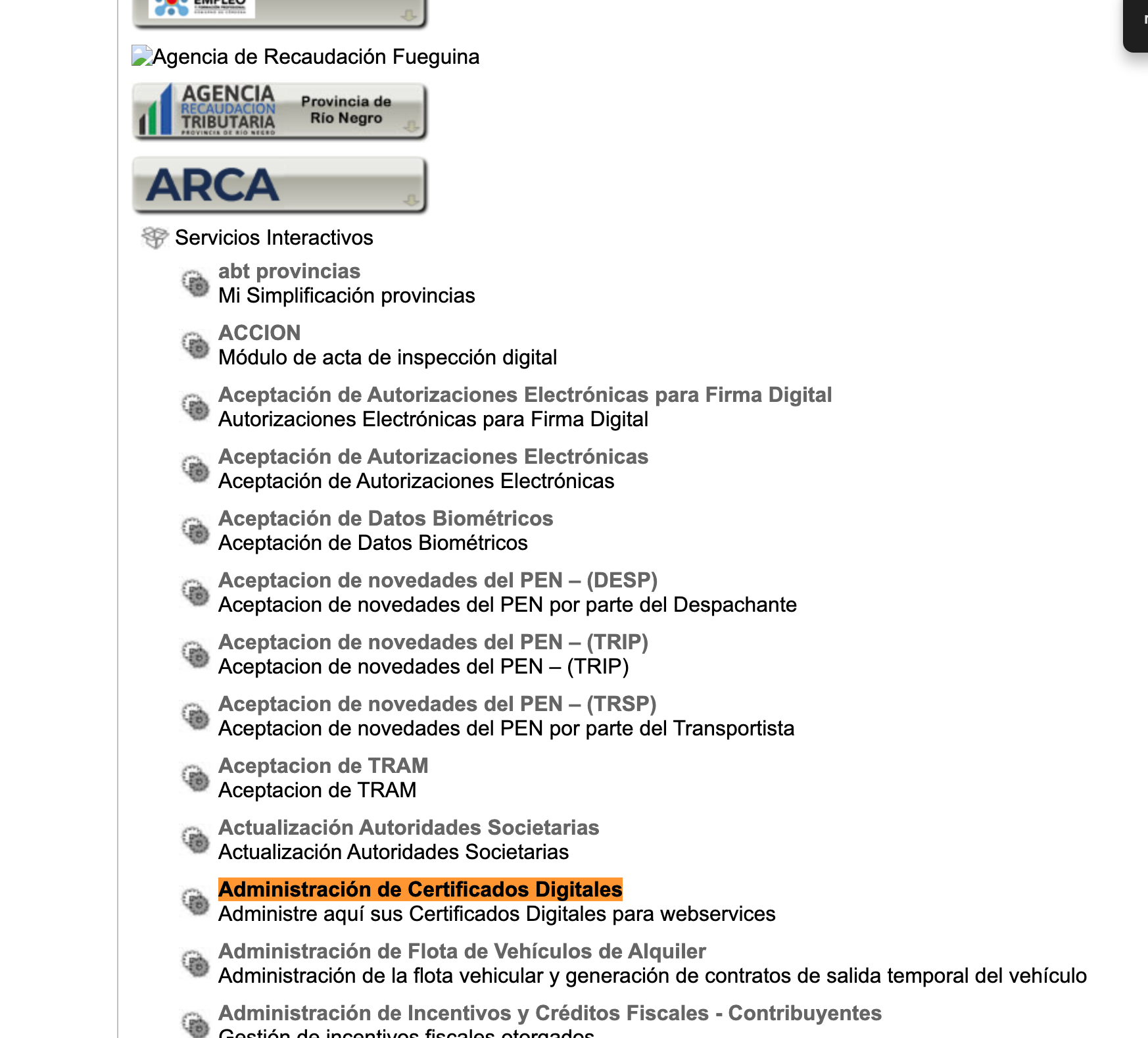 primero tuvimos que agregar la relacion de arca para los servicios interactivos de Administracion de certificados digitales